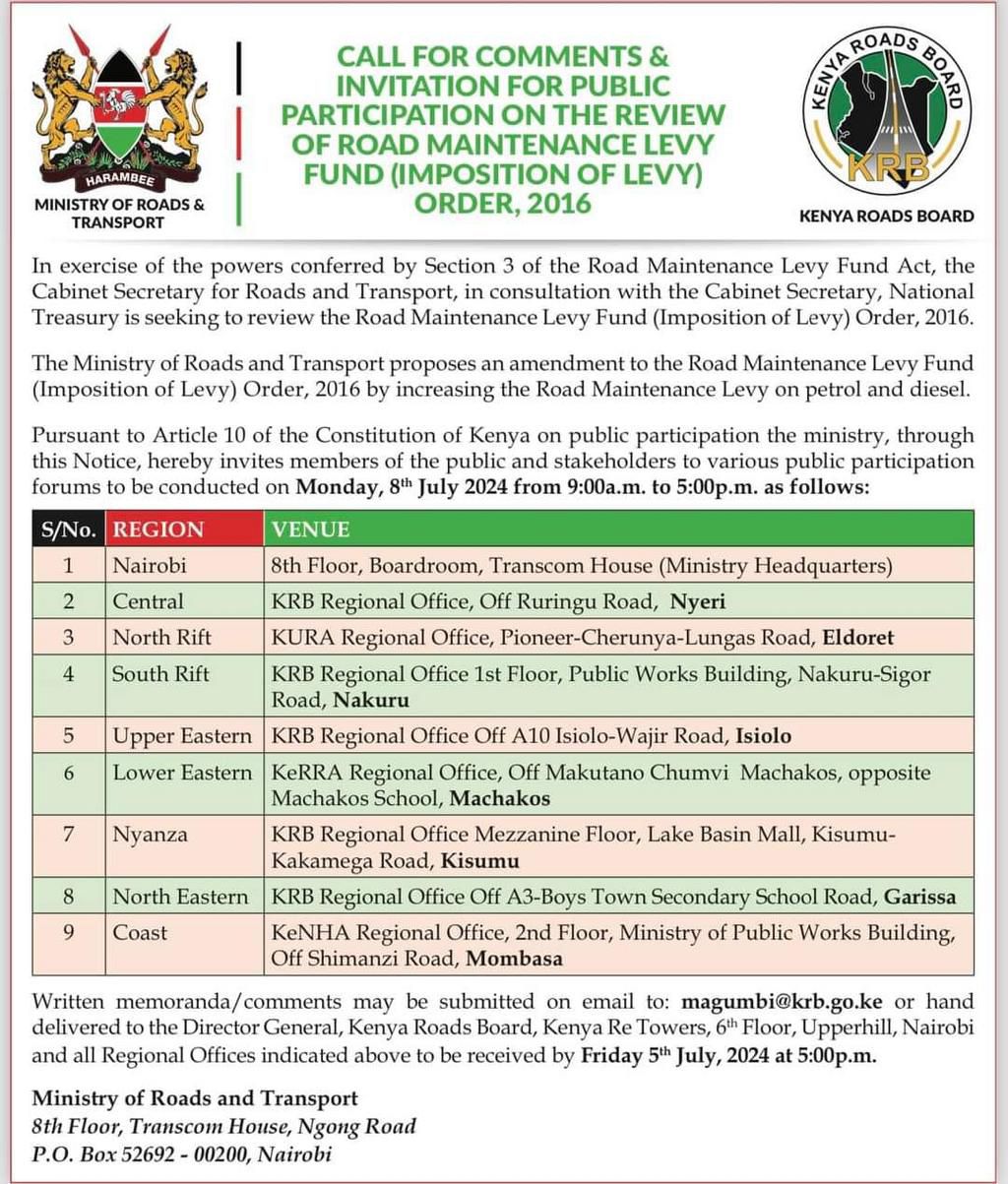 “Pursuant to Article 10 of the Constitution of Kenya on public participation the ministry, through this Notice, hereby invites members of the public and stakeholders to various public participation forums to be conducted on Monday, 8th July 2024 from 9:00 a.m. to 5:00 p.m. as follows,” adds the notice.