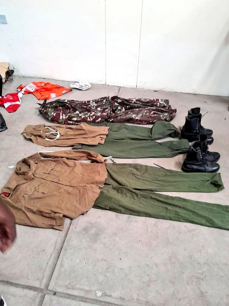 The suspects were apprehended in an ongoing operation at a warehouse in Nairobi, where several boxes containing fake US dollars, suspected stolen jungle fatigues for Administration Police Service officers, military boots, customs reflector jackets, and other items were seized.