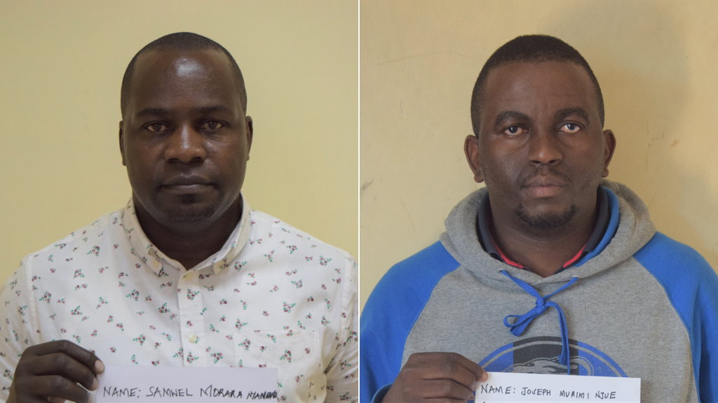 The two, Samuel Morara Nyambane and Joseph Murimi Njue were arrested when they presented themselves at the DCI Headquarters as officers of the Directorate of Military Intelligence and National Intelligence Service respectively, seeking assistance in apprehension of a suspect.