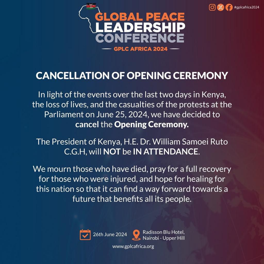 The Global Peace Leadership Conference (GPLC) has canceled its highly anticipated opening ceremony in response to the recent violence and unrest in Kenya.