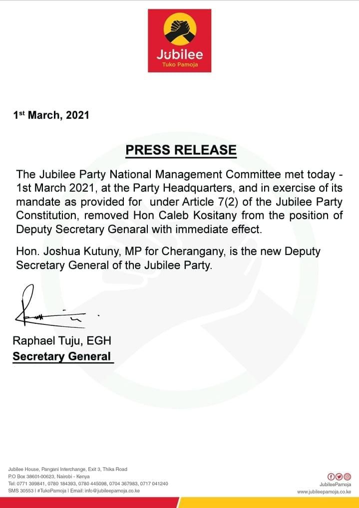 “Jubilee Party national Management Committee met today, 1st March, 2021, at the Party Headquarters, and in exercise of its mandate as provided for under article 7(2) of the Jubilee party constitution, removed Hon. Caleb Kositany from the Position of Deputy Secretary General with immediate effect,” said the statement.