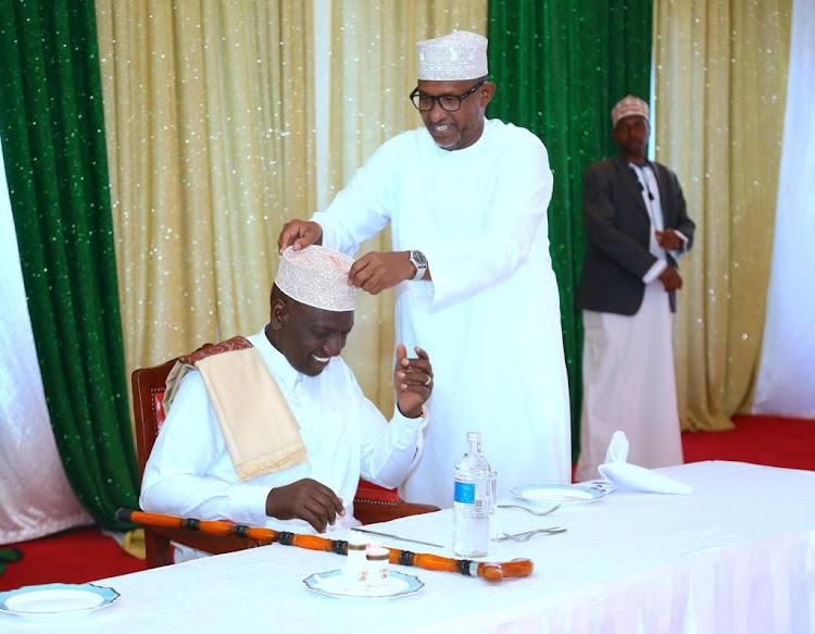 Defence CS Aden Duale adjusting President William Ruto's Kufi during iftar dinner at KICC on April 11, 2023