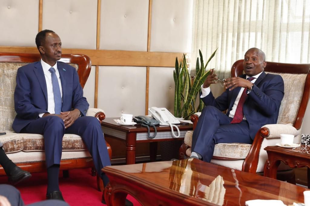 Interior CS Kithure Kindiki with his Somalia counterpart Mohamed Ahmed Sheikh Ali for a high-level ministerial meeting on cross-border cooperation between the Republic of Kenya and the federal government of Somalia.