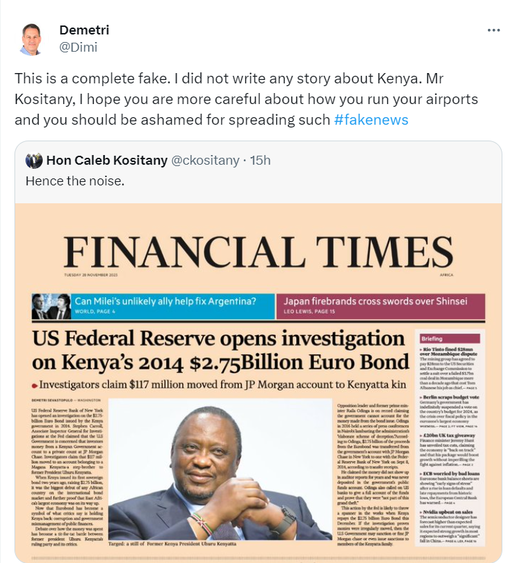 “This is a complete fake. I did not write any story about Kenya. Mr Kositany, I hope you are more careful about how you run your airports and you should be ashamed for spreading such fake news,” the journalist said.
