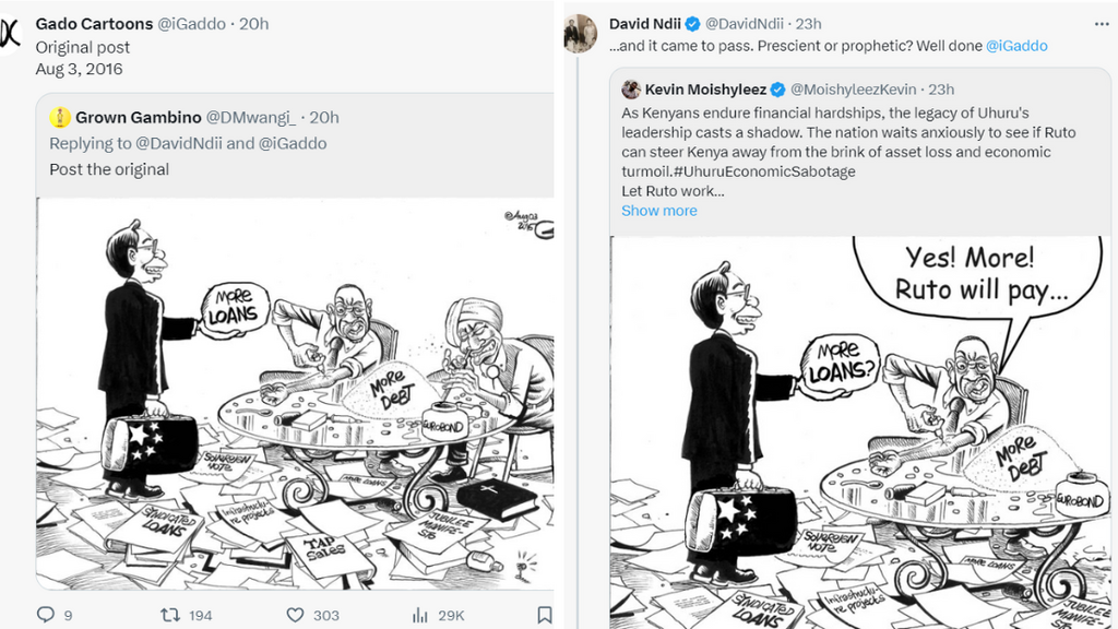 He had shared a cartoon depicting Kenya’s appetite for loans by Godfrey Mwampembwa, a.k.a Gado.
