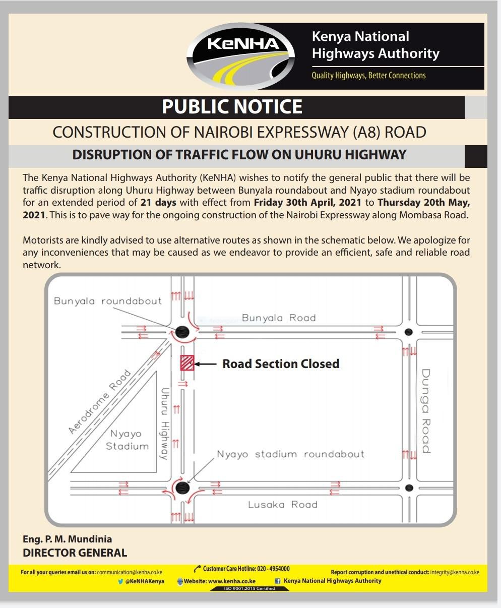 KeNHA has urged motorists to use alternative routes: Nyayo Stadium roundabout to Lusaka road, Workshop Road and onto Bunyala Road before proceeding to Uhuru Highway.