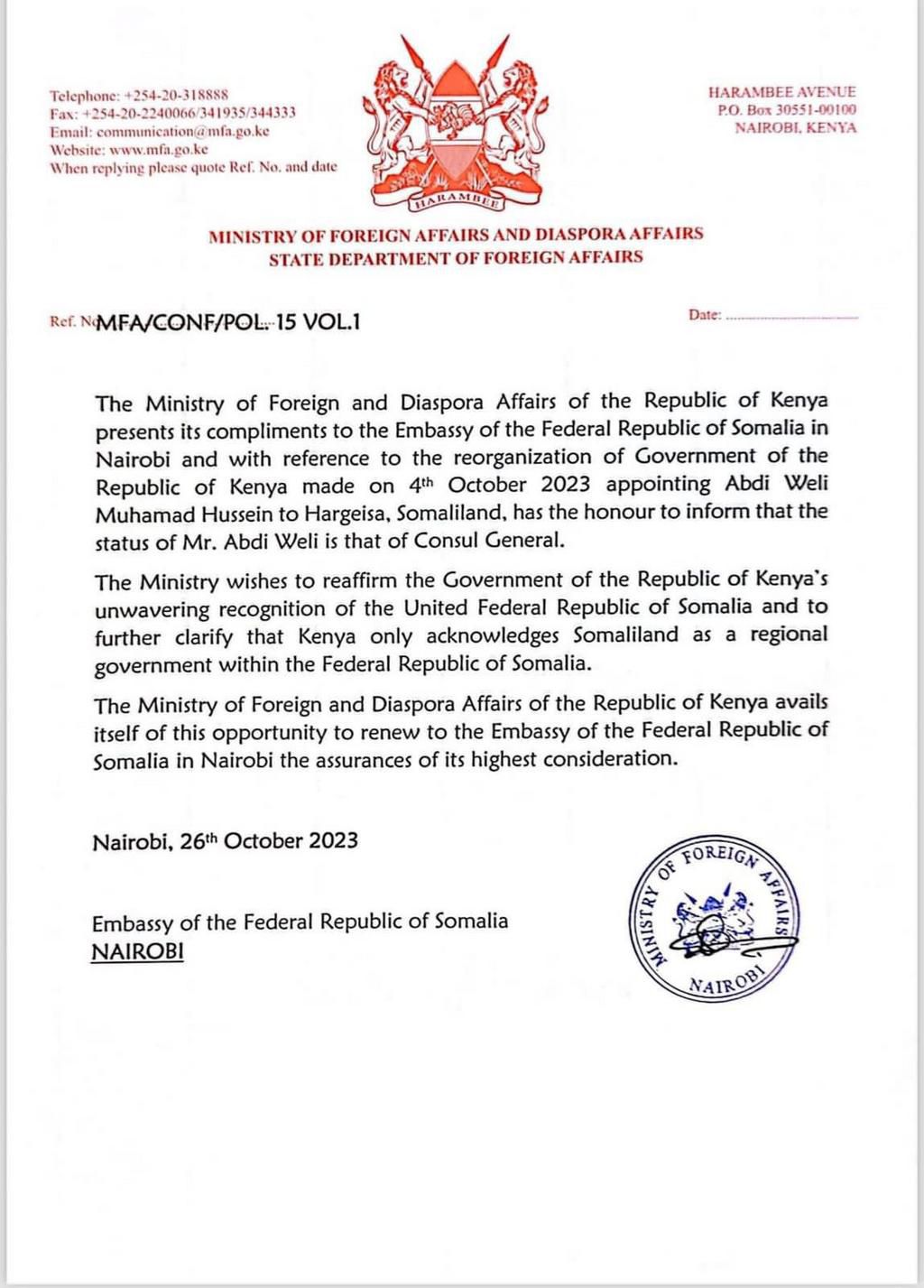 The letter from the Ministry of Foreign Affairs officially confirmed the decision, stating that Abdi Weli Mohamud Hussein's status is that of a Consul General.