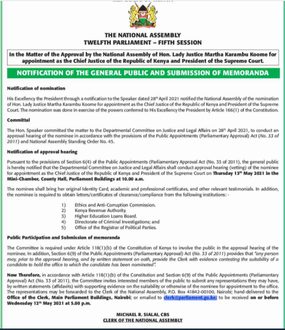 The general public is hereby notified that the Departmental Committee on Justice and Legal Affairs shall conduct approval hearing/vetting of the nominee for appointment as the Chief Justice and President of the Supreme Court…,” read the statement in part.