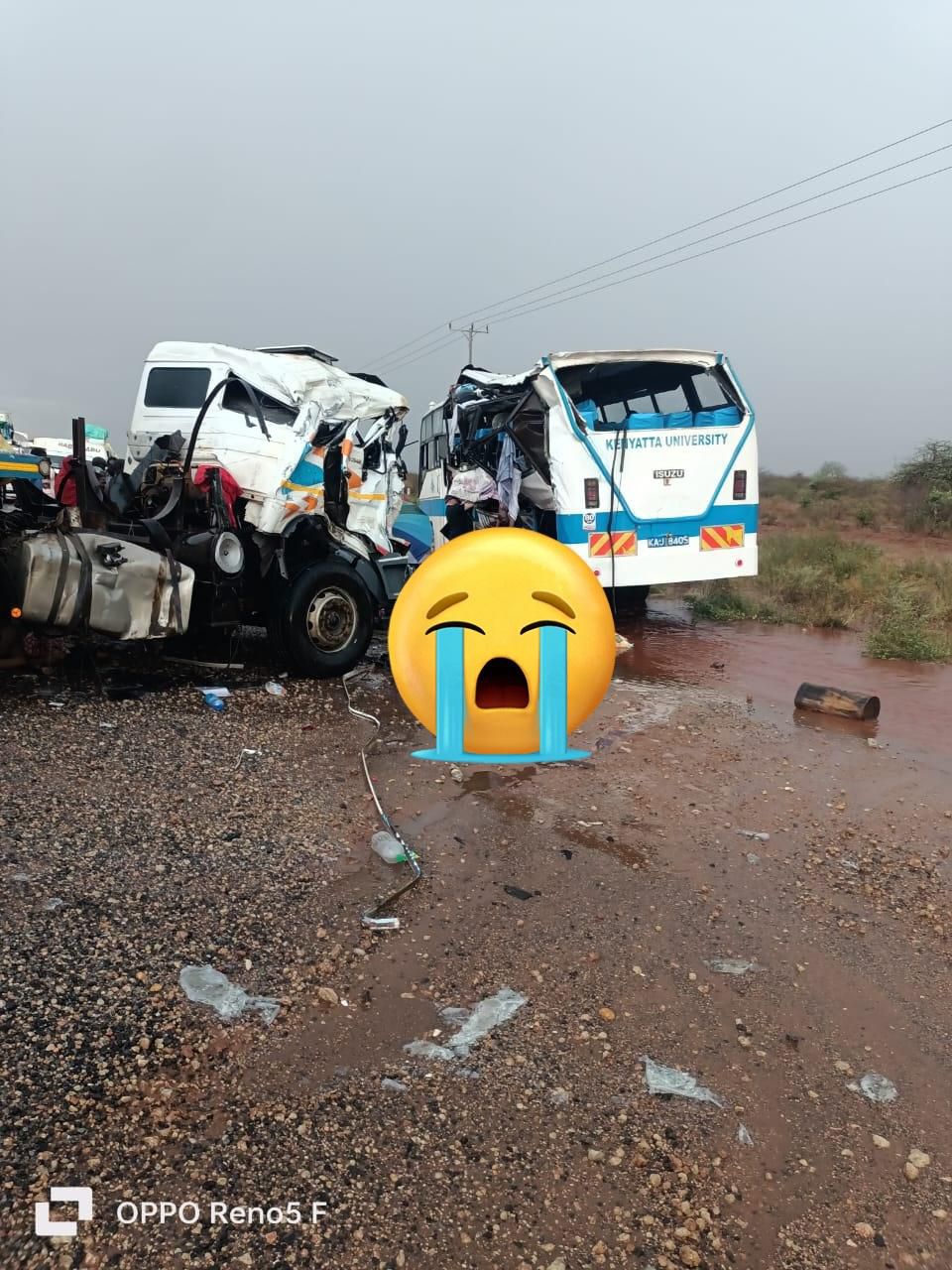 Tragedy struck on the busy Mombasa-Nairobi Highway on Monday, March 18 as a trailer collided with a Kenyatta University bus near Voi, leaving several students feared dead and many more injured.