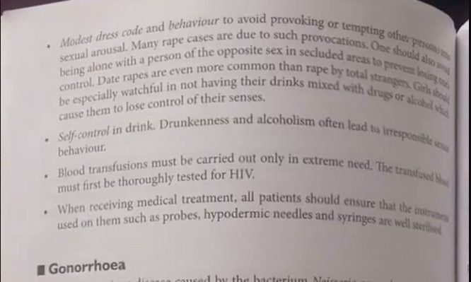 The issue stems from a sub-topic titled 'Prevention of AIDS,' where the textbook contains a passage implying that a person's mode of dressing and behaviour could provoke sexual assault.