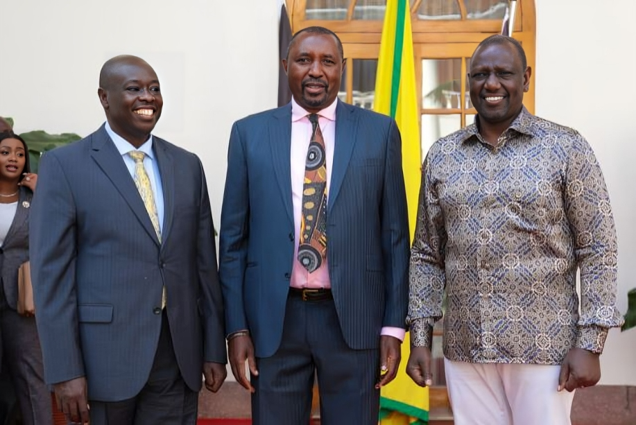 File image of former Bahati Member of Parliament Kimani Ngunjiri sandwitched between UDA party leaders, President William Ruto and his deputy, Rigathi Gachagua