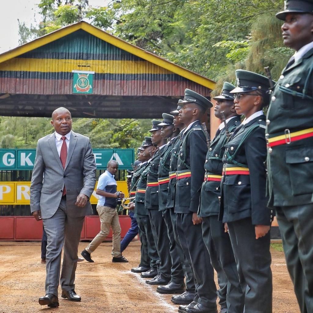 CS Kithure Kindiki inspects a guard of honour at Mwea Prison in Kirinyaga County on Monday, May 8, 2023.
