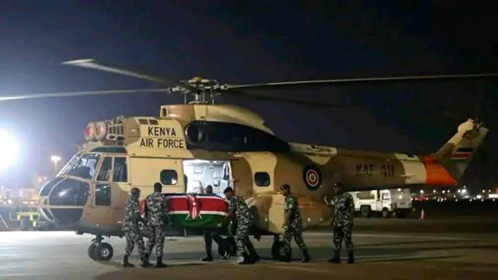 Military personnel load the body only a helicopter for onward transportation to Mamboleo grounds.