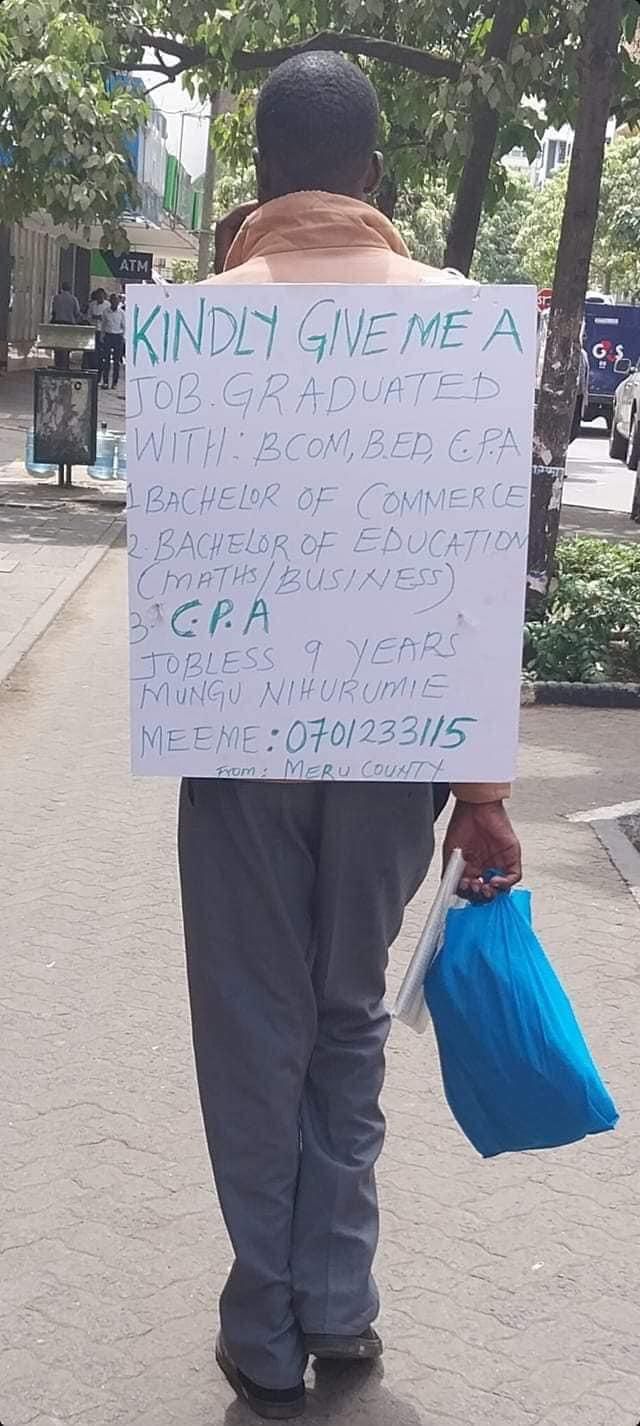 "A gentleman named Meeme Samuel Makamba, whose picture went viral showing him seeking a job in the streets with a manilla-inscribed plea pinned to his back, can finally rest assured of job security.