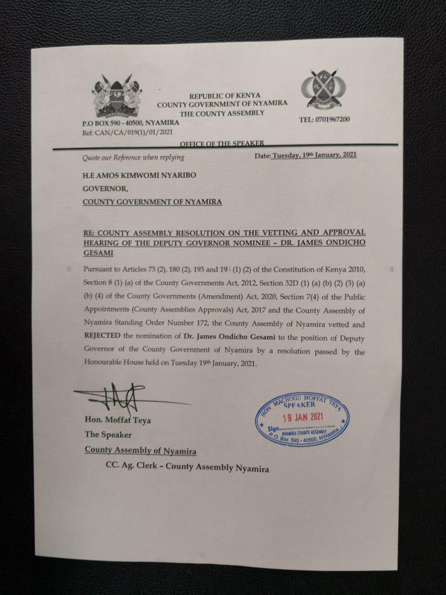 The County Assembly of Nyamira vetted and rejected the nomination of Dr. James Ondicho Gesami to the position of Deputy Governor of the County Government of Nyamira by a resolution passed by the Honourable house held on Tuesday 19th January, 2021,” read a letter signed by the House Speaker Moffat Teya.