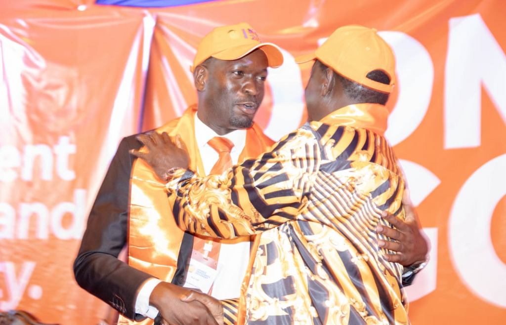 ODM Secretary-General Edwin Sifuna shares a hug with ODM party leader Raila Odinga during the party's 2022 National Delegates Conference at the Kasarani Stadium Indoor Arena