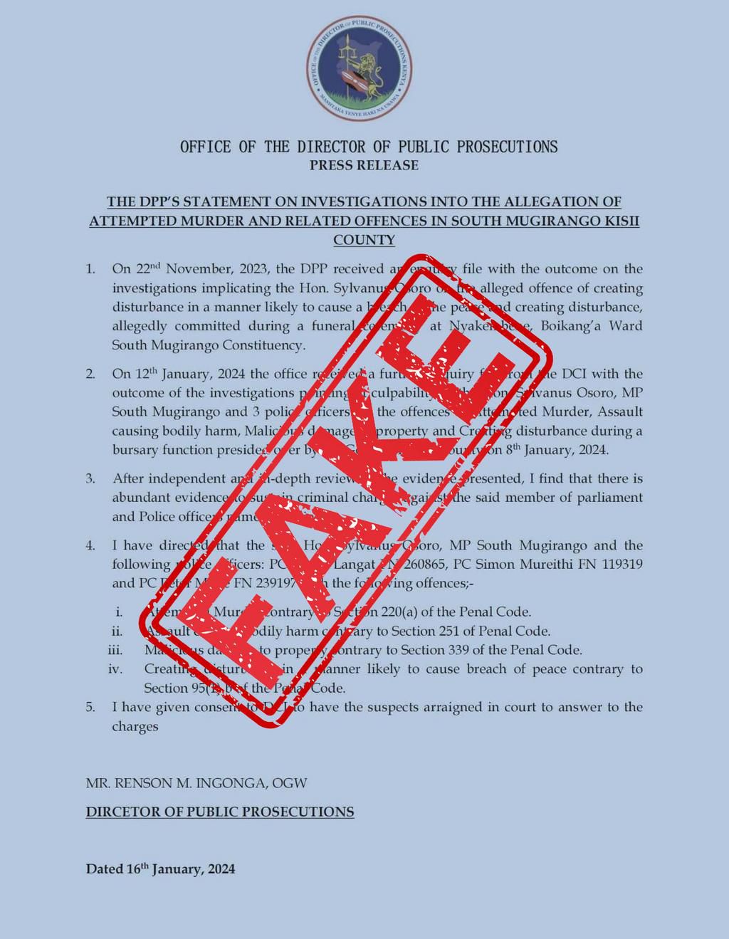 The purported communique, allegedly authored by DPP Renson Ingonga, implied Osoro's involvement in violence during a function in his constituency, alongside three police officers.