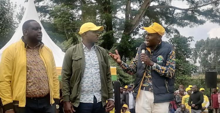 Kitutu Chache North MP Japhet Nyakundi, UDA Secretary General Cleophas Malala and South Mugirango MP Sylvanus Osoro during a UDA recruitment drive in Kitutu Chache South