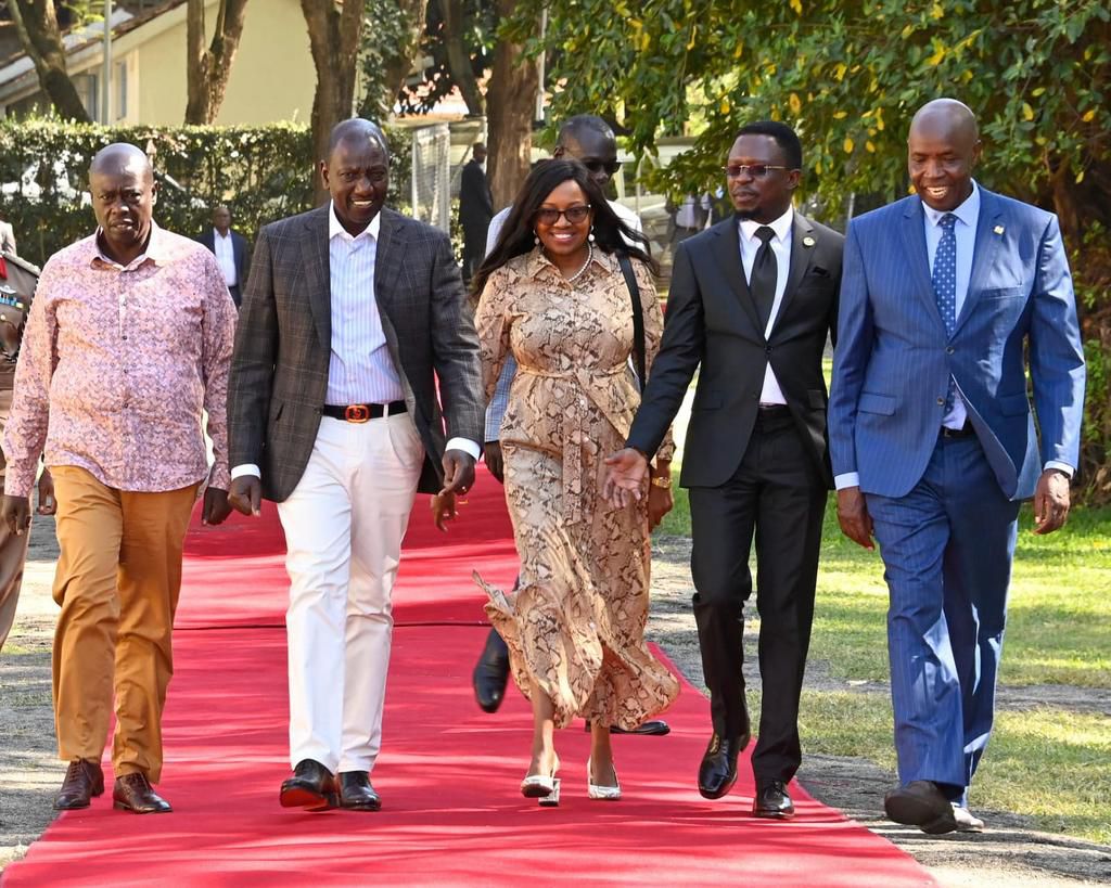 From left: DP Rigathi Gachagua, President William Ruto, Governor Susan Kihika, CSs Ababu Namwamba & Ezekiel Machogu at the Kenya Music Festival Winners' State Concert, State House, Nakuru.