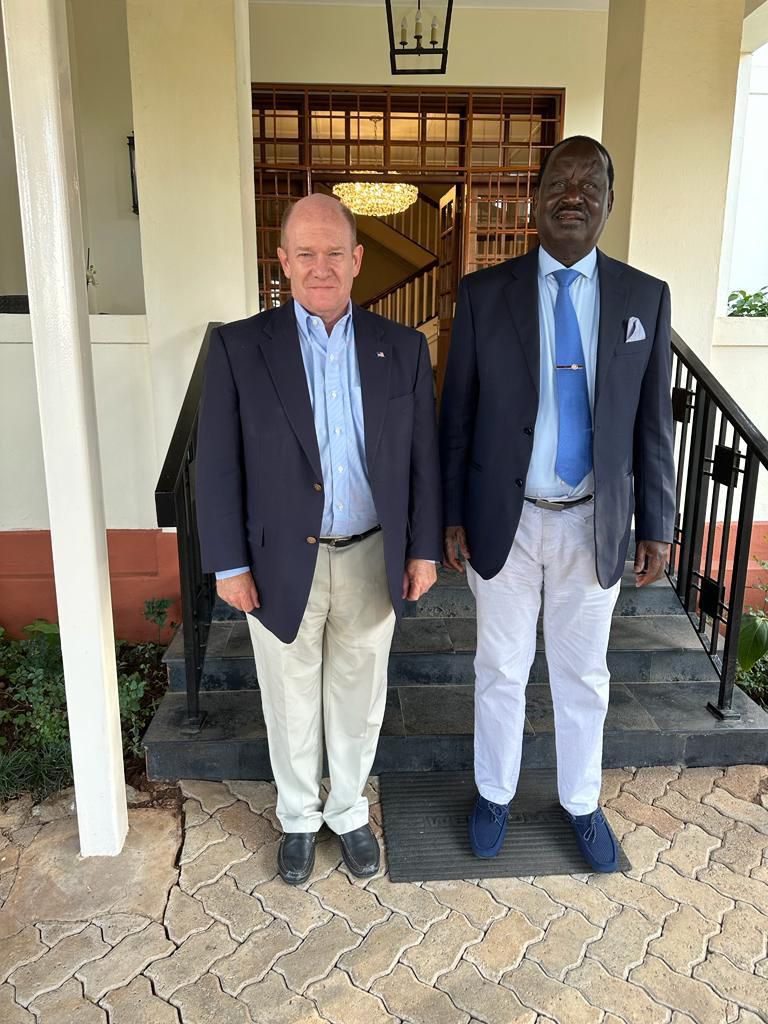 Azimio leader Raila Odinga with Senator Chris Coons on Sunday, August 13, 2023