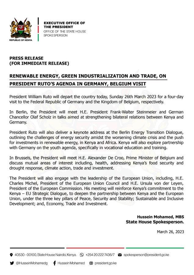 President William Ruto will leave the country today, Sunday March 26, 2023 for a four-day visit that will see him visit the Federal Republic of Germany and the Kingdom of Belgium, respectively.