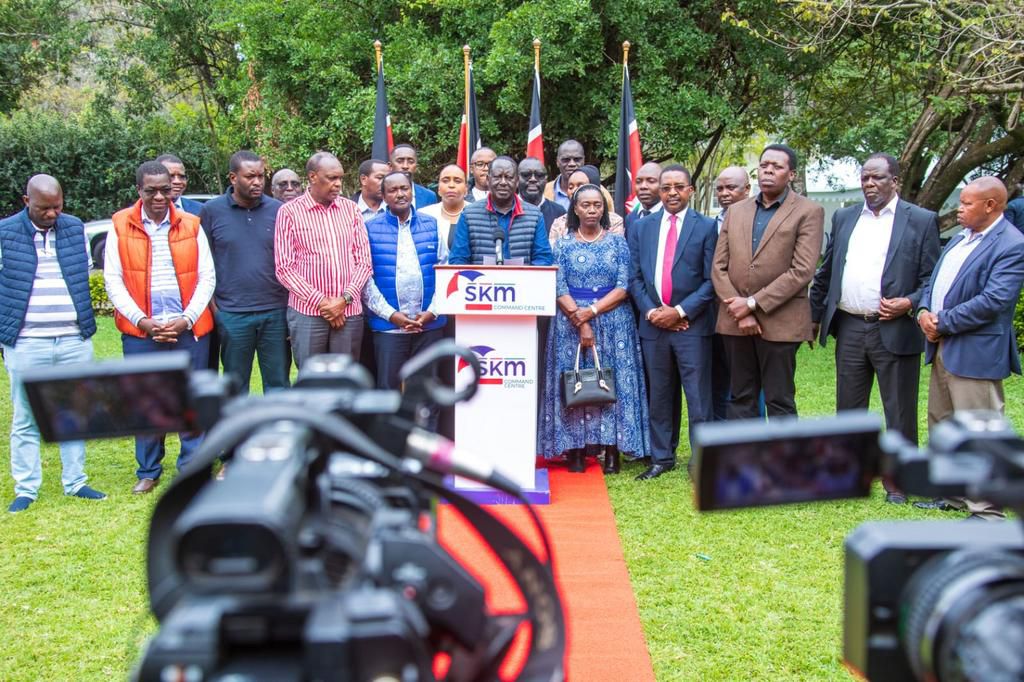 Raila Odinga, Martha Karua, Kalonzo Musyoka and other Azimio leaders addressing the press on President William Ruto's performance