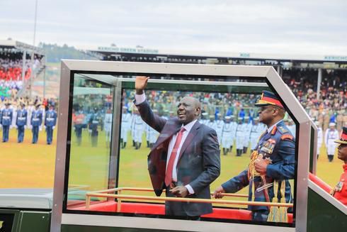 President William Ruto acknowledging greetings from the crowd during Mashujaa Day celebrations in Kericho