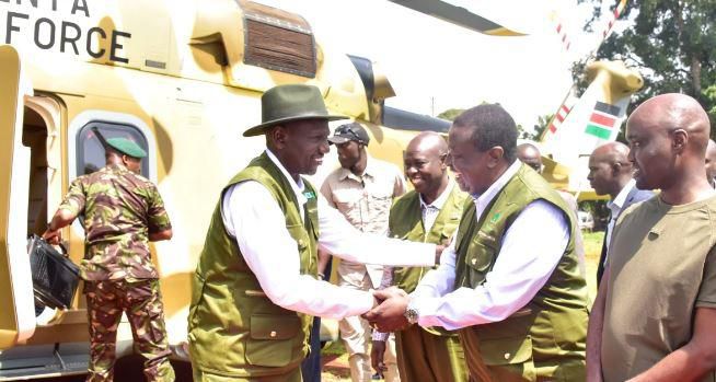President William Ruto shaking hands with Prime CS Musalia Mudavadi as DP Rigathi Gachagua watches in Kaptagat Forest in Elgeyo Marakwet County on July 1, 2023