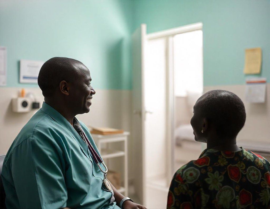 An AI generated image of a doctor smiling while talking to a patient in a hospital