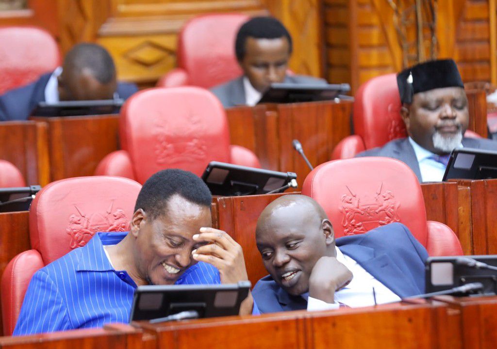 Senator Richard Onyonka and Samson Cherargei during a session of the Senate Committee on Roads, Transportation and Housing