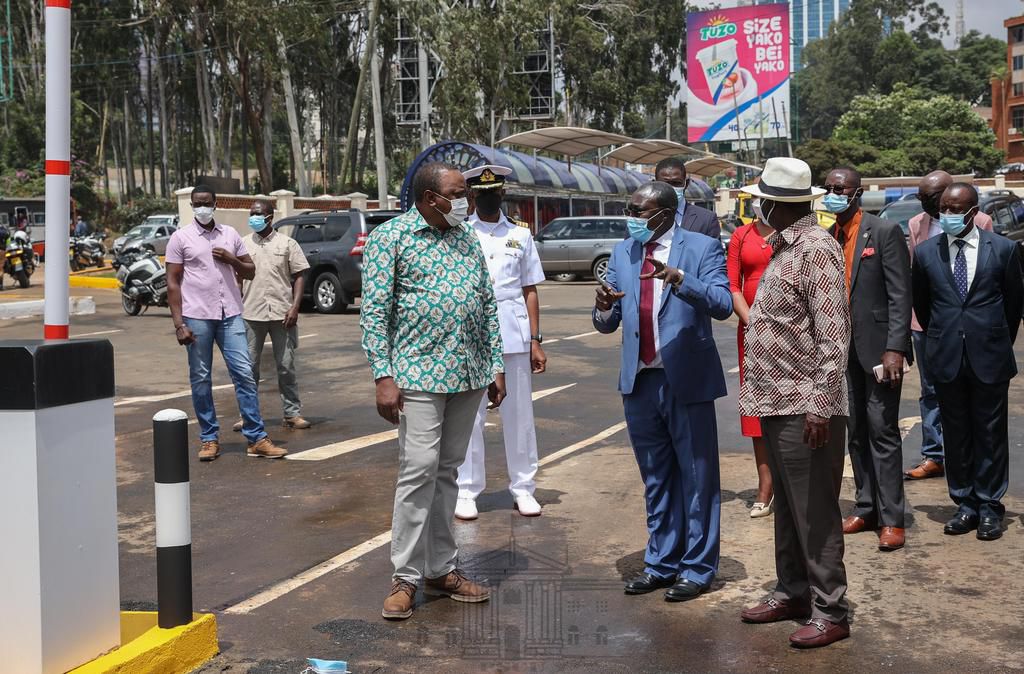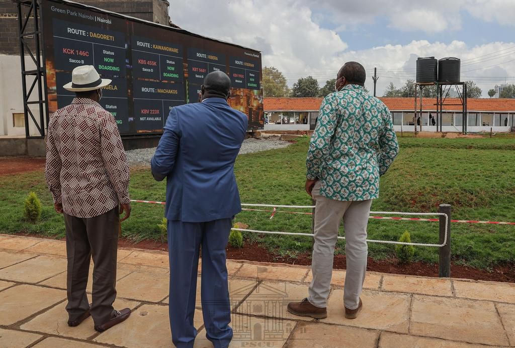"President Uhuru Kenyatta has this morning made an extensive inspection tour of the Green Park Bus Terminus on Haile Selassie Avenue in Nairobi. The Head of State, who is accompanied by former Prime Minister Raila Odinga, expressed satisfaction with the ongoing construction of the ultra-modern bus station, being developed by the Nairobi Metropolitan Service, as part of Government efforts to decongest the city's CBD," said a statement from State House.