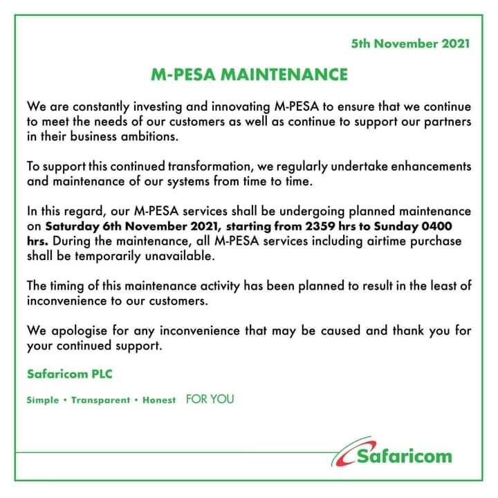 "In this regard, our M-PESA services shall be undergoing planned maintenance on Saturday 6th November 2021, starting from 2359hrs to Sunday 0400hrs," read the communication.