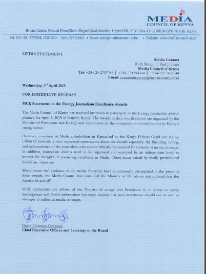 MCK CEO and Secretary to the Board David Omwoyo, further explained that a section of the media stake holders ahead of the award ceremony which was to take place on Thursday, had expressed reservations in regards to financing, timing and independence of the journalist who cannot ethically be awarded by subject of media coverage.