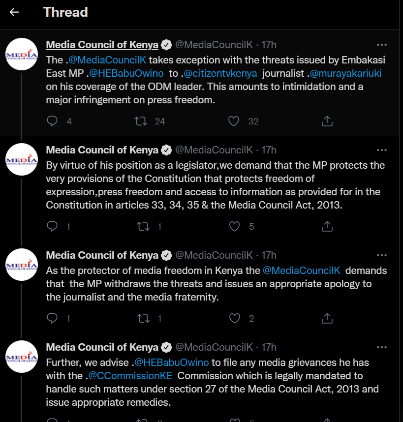 “Media Council of Kenya takes exception with the threats issued by Embakasi East MP Babu Owino to Citizen TV journalist Muraya Kariuki on his coverage of the ODM leader. This amounts to intimidation and a major infringement on press freedom”