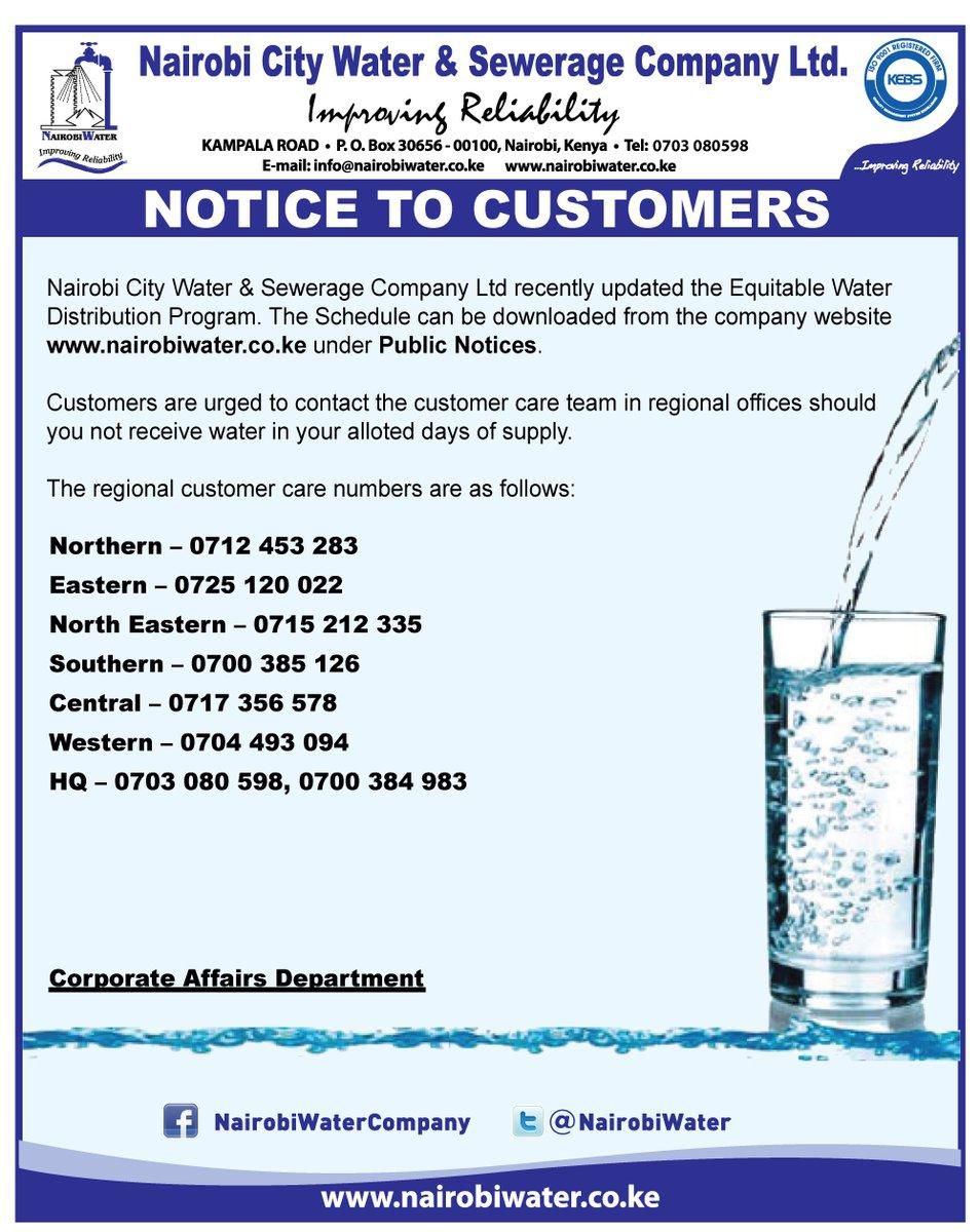 In a notice to customers, NCWSC stated: “Customers are urged to immediately contact the customer care team in regional offices should you not receive water in your allotted days of supply.”