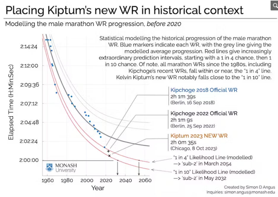 Economists have been modelling athletic performance for decades. We now know that so long as the arrival rate of small improvements (think: a new supplement, shoe foam, or training aid) across each factor is roughly consistent over time, we should expect that the summary outcome will have reasonably predictable behaviour. It’s this overall process we can model.