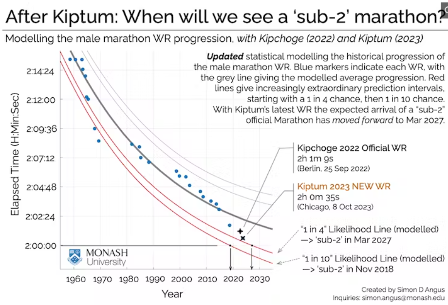 Second, if we follow this line – that is, we assume that a Kiptum-like runner is at the start line in future official marathons – then we find that the arrival of a sub-2 marathon has been brought forward by five years to March 2027.