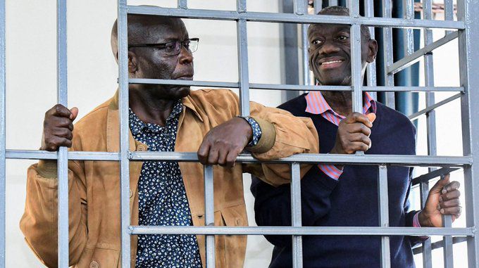 Veteran Ugandan politician, Colonel (Rtd) Dr Kizza Besigye (right) appears in Martial Court alongside his aide Obeid Lutale (left)