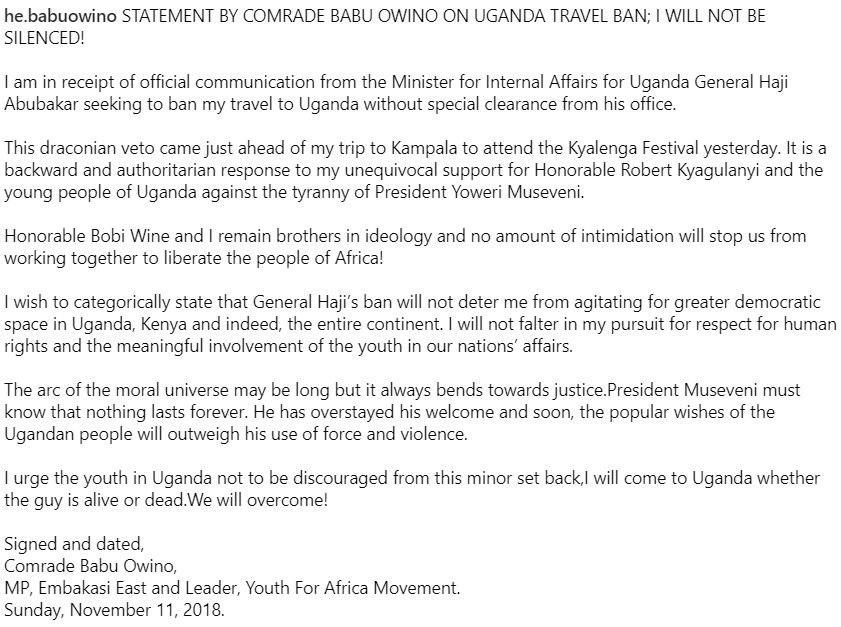 “Honorable Bobi Wine and I remain brothers in ideology and no amount of intimidation will stop us from working together to liberate the people of Africa! I wish to categorically state that General Haji’s ban will not deter me from agitating for greater democratic space in Uganda, Kenya and indeed, the entire continent. I will not falter in my pursuit for respect for human rights and the meaningful involvement of the youth in our nations’ affairs,” read part of Babu’s statement.