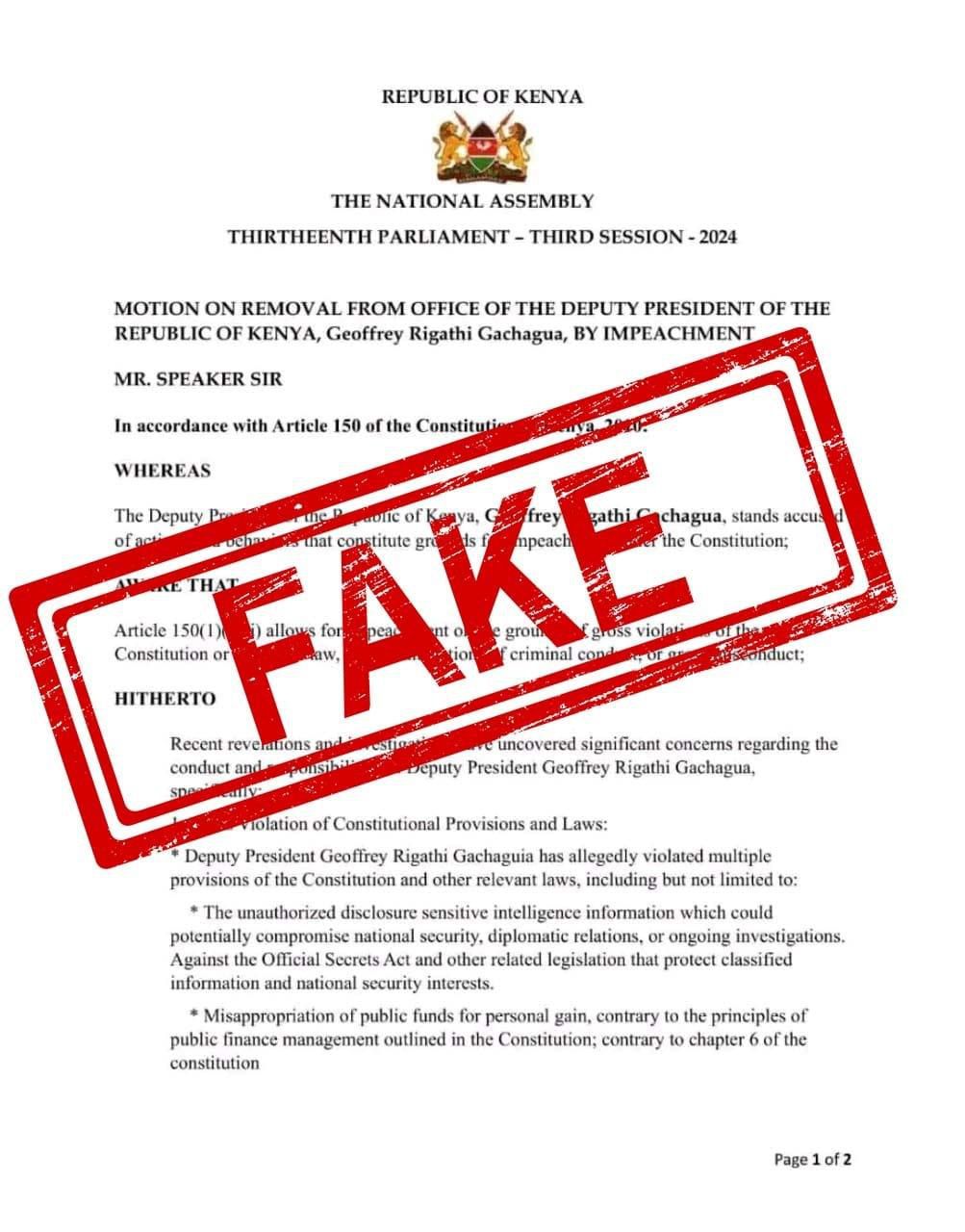 Mathira MP Eric Wamumbi has categorically dismissed a letter circulating on social media that purports to initiate impeachment proceedings against Deputy President Rigathi Gachagua.