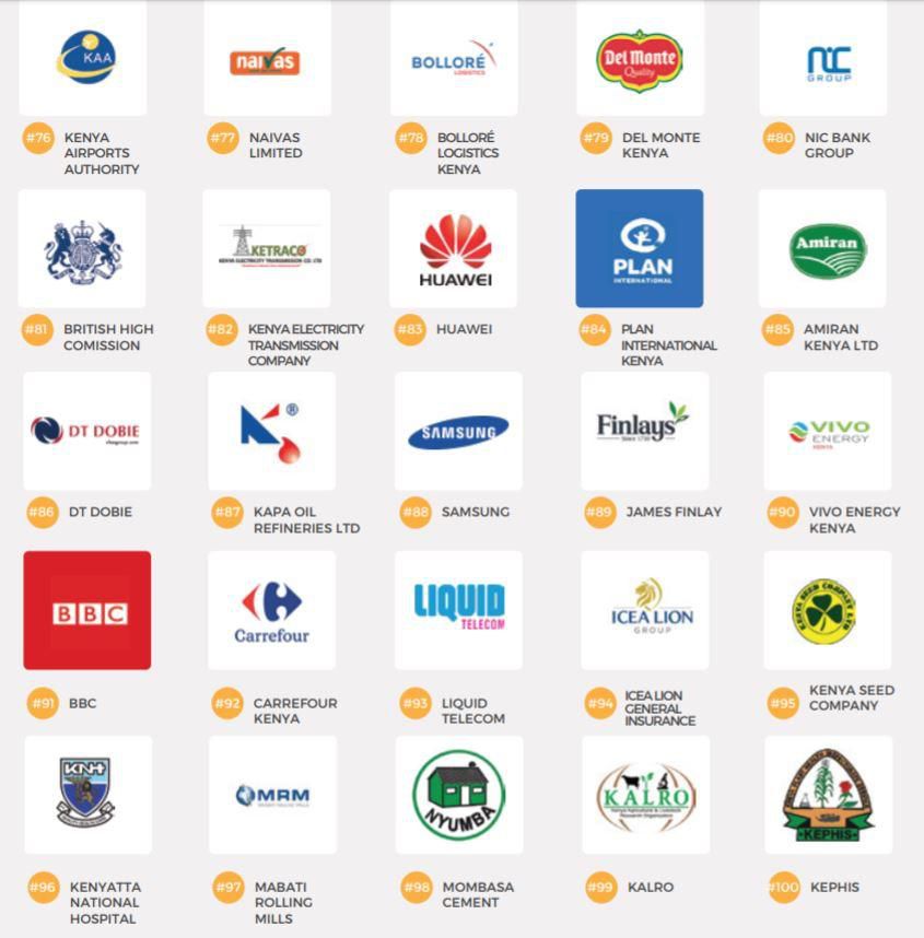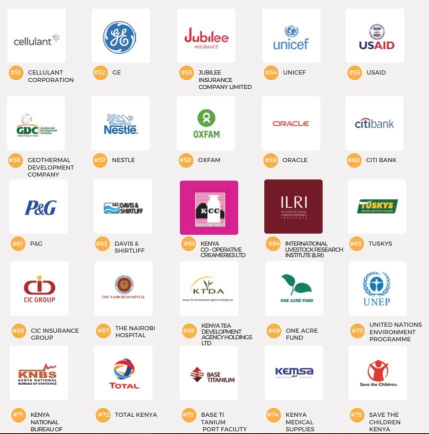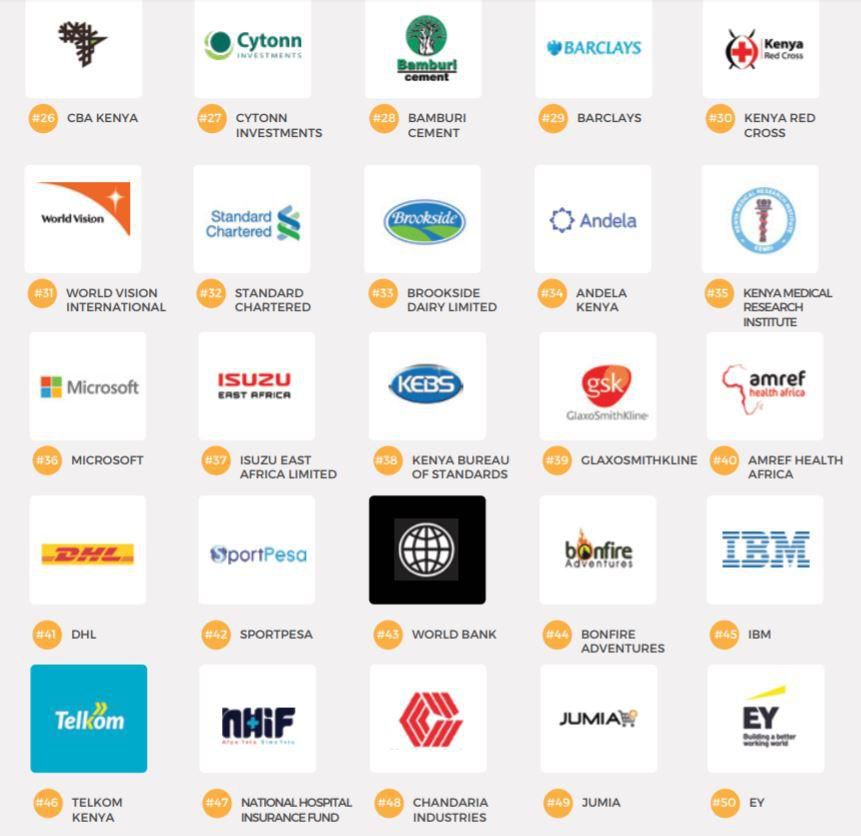 In order of rank, the other top 25 companies were found to be: Kenya Pipeline Company (KPC) at number six, KenGen, PWC, Coca Cola, Kenya Airways, Deloitte, Unilever, Kenya Power, Equity Bank, British American Tobacco, Centum, Google, Kenya Ports Authority (KPA), Airtel, Britam Holdings, Central Bank of Kenya (CBK), Nation Media Group, Royal Media Services, BIDCO Africa and Toyota respectively.