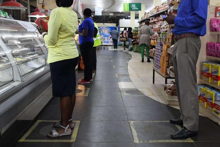 File image of customers at a Kenyan supermarket observing social distancing rules
