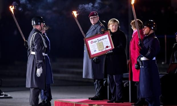 The German military’s highest civilian honour was bestowed on Angela Merkel at a ceremony at the defence ministry in Berlin. Photograph: Getty Images