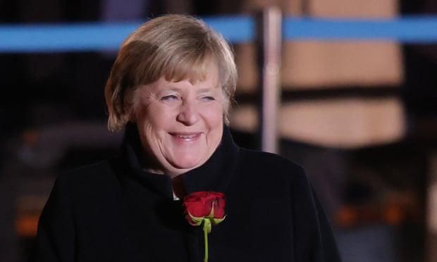 Outgoing German chancellor Angela Merkel holds a red rose at the conclusion of her military tattoo ceremony hosted by the Bundeswehr on 2 December. Photograph: Sean Gallup/Getty Images