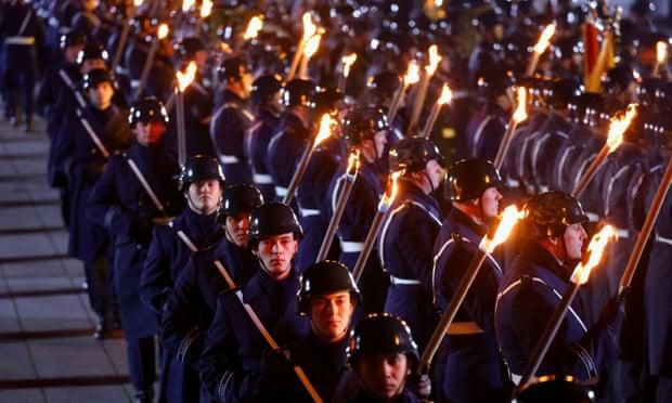 Dressed in a simple black coat and black gloves, Europe’s most powerful politician looked sombre, betraying little emotion, as she watched torch-carrying soldiers in full regalia parade through the courtyard of Berlin’s defence ministry.
