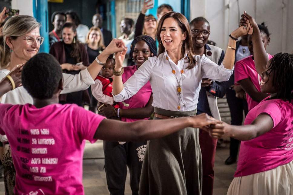 Queen Mary of Denmark (then-Crown Princess) joins Kenyan children in a dance on her visit to the country, November 2018