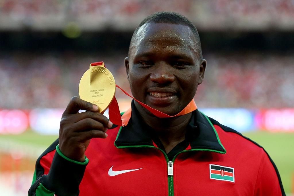 BEIJING, CHINA - AUGUST 27: Gold medalist Julius Yego of Kenya poses on the podium during the medal ceremony for the Men's Javelin final during day six of the 15th IAAF World Athletics Championships Beijing 2015 at Beijing National Stadium on August 27, 2015 in Beijing, China. (Photo by Alexander Hassenstein/Getty Images for IAAF)