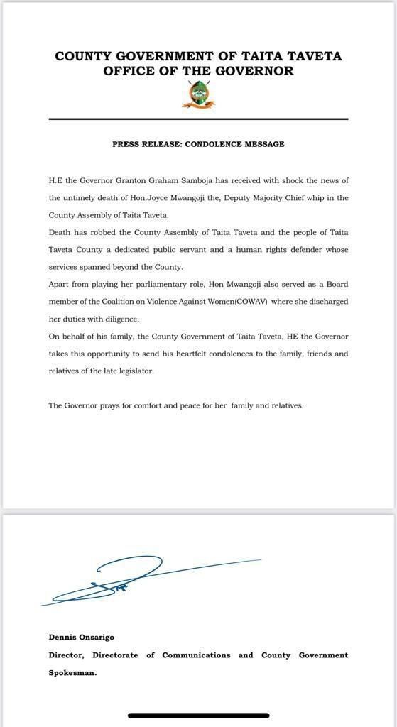 The County Assembly of Taita Taveta has announced the sudden passing on of Hon.Joyce Mwangoji this morning, 25th April, 2021, at around 7.30am, while being rushed to St.Joseph Hospital, Ikanga .